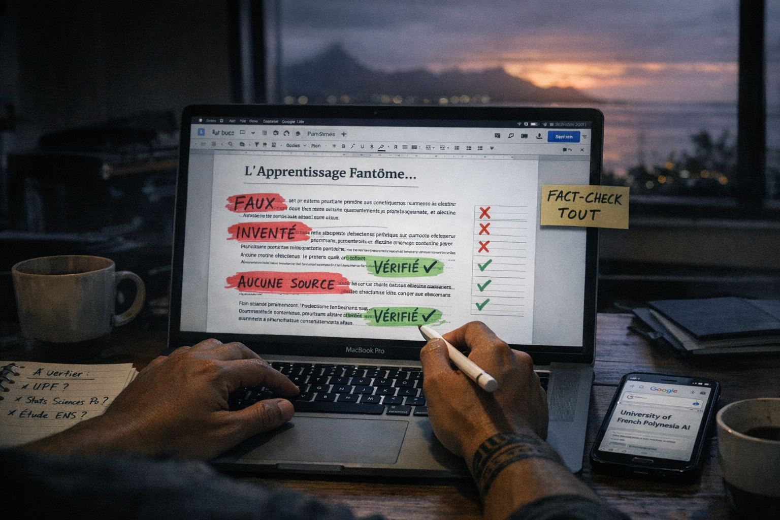 Thématiques : hallucination IA, fact-checking intelligence artificielle, IA invente données, apprentissage fantôme, Polynésie française, Tahiti, vérification sources