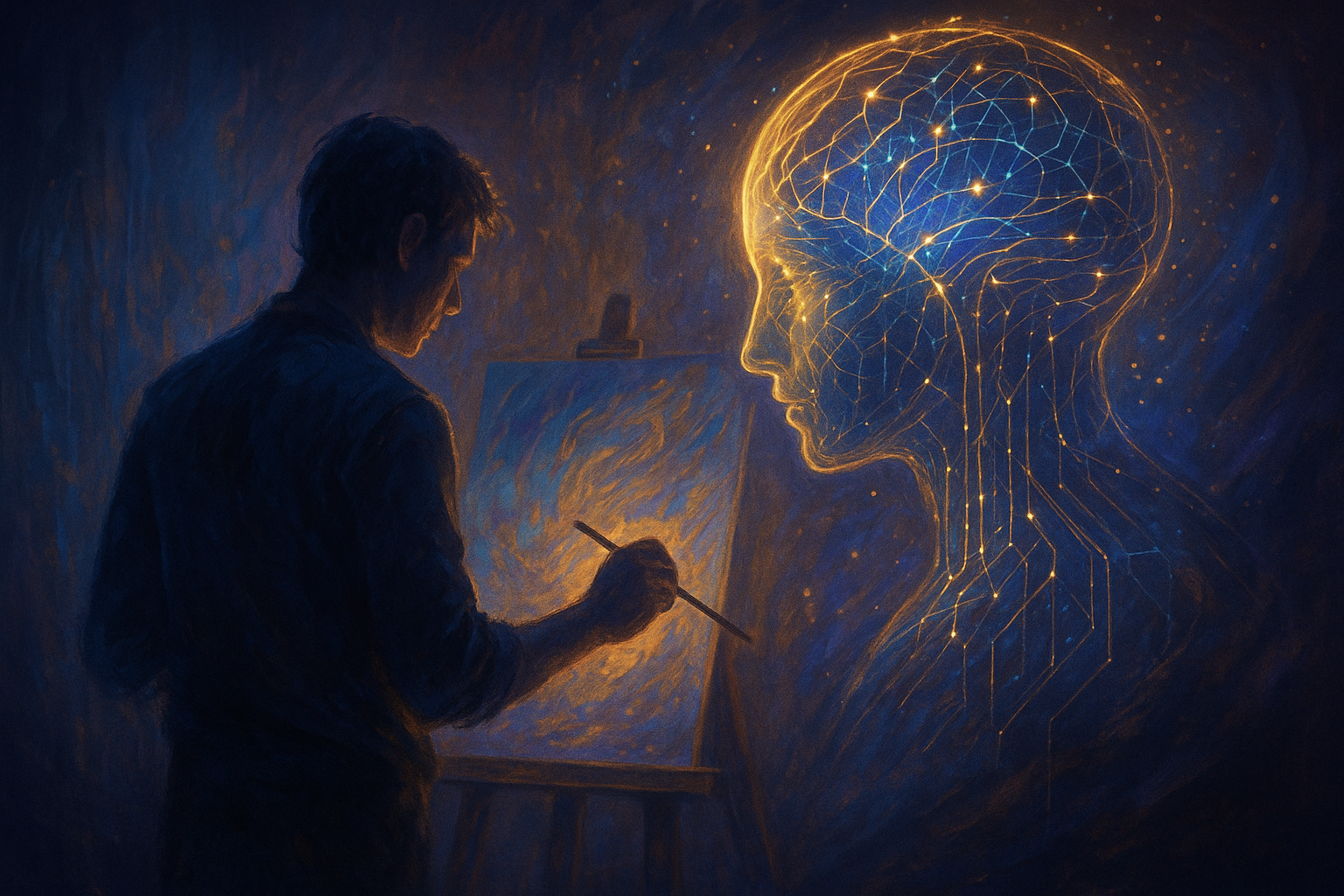 Illustration représentant la rencontre entre la créativité humaine et l’intelligence artificielle, montrant un artiste collaborant avec une interface lumineuse générative, symbolisant la transformation du processus créatif à l’ère numérique.